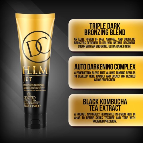С H.I.M. Jet™ — ваш цвет кожи готов к супербыстрому старту! Этот суперскоростной микс активаторов и ДГА создан для альфа-парней, которым необходим мгновенный, максимальный результат и персональный подход. Эксклюзивная формула сочетает в себе бронзаторы и кетоны малины, обеспечивая насыщенный, естественный золотисто-бронзовый оттенок загара. Специальный комплекс постепенного раскрытия и усиления цвета обеспечивает максимально глубокий и стойкий шоколадный оттенок. Экстракты трюфеля и черной комбучи поддерживают здоровье микробиома кожи, богаты натуральными АНА-кислотами, и работают в синергии, улучшая текстуру и тон кожи. HIM Jet™ помогает поддерживать необходимый уровень увлажнения кожи, смягчает, успокаивает и восстанавливает, придает ей свежий и отдохнувший вид — как после отпуска. H.I.M. Jet™ устанавливает новые суперскоростные стандарты для тех, кто предпочитает только элитные результаты.